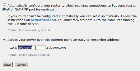 Chuyển qua liên kết Network hãy chắc chắn rằng Subsonic sẽ tự động cấu hình chuyển tiếp trên router của bạn, vì đây là cách tốt nhất khi bạn truy cập từ bên ngoài mạng. Nếu như bạn có tài khoản trên Subsonic, bạn có thể đưa nó vào đường dẫn URL của bạn. Xong xuôi nhấn Save để lưu lại thiết lập.